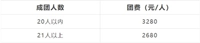 费用:15-20人3280元/人,21人及以上2680元,低于15人不成团。