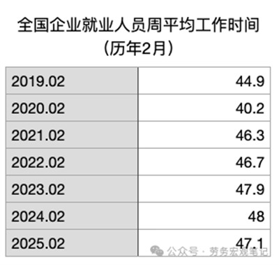 尽管今年2月份的工作时间出现了下降,但从整体趋势来看,工作时间仍然是在增加的。尤其是与前几年相比,2025年2月份的工作时间(47.1小时)依然处于较高水平。例如,2019年没有任何一个月的工作时间超过47小时,而如今即便是工作时间最低的2月份,仍然比几年前的全年平均水平高。这说明,尽管偶尔会有波动,但劳动者的工作负担总体上在持续加重。