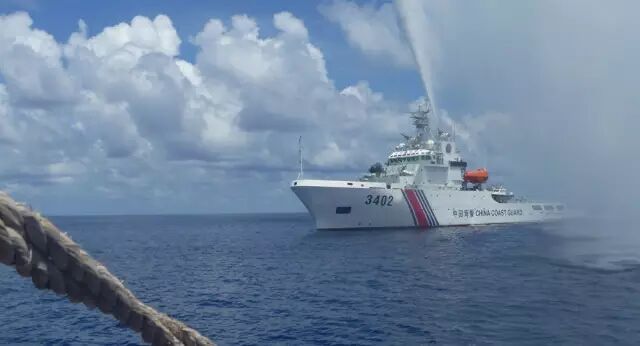 ▲中国海警船用高压水枪驱离驶入黄岩岛海域的菲律宾渔船。(俄罗斯卫星新闻网)