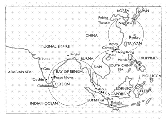 图~1所示是一幅由日本经济史学家滨下武志制作的“朝贡时期的东西方贸易路线图”。如这个图所示﹐早在几百年前﹐亚洲区域内部的贸易和经济交往一直就很频繁。当时的东亚国家为了获得类似胡椒和香料这样“本国所不能生产的物资”﹐[1] 就与东南亚国家保持着密切的贸易和经济交往关系。