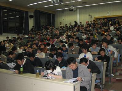 廖子光先生的演讲受到聆听的学生们的热烈欢迎。有近300个座位的清华大学三教2101大教室座无虚席,不少晚到的同学只好站着听讲。图为正在演讲的廖子光先生和讲座现场。