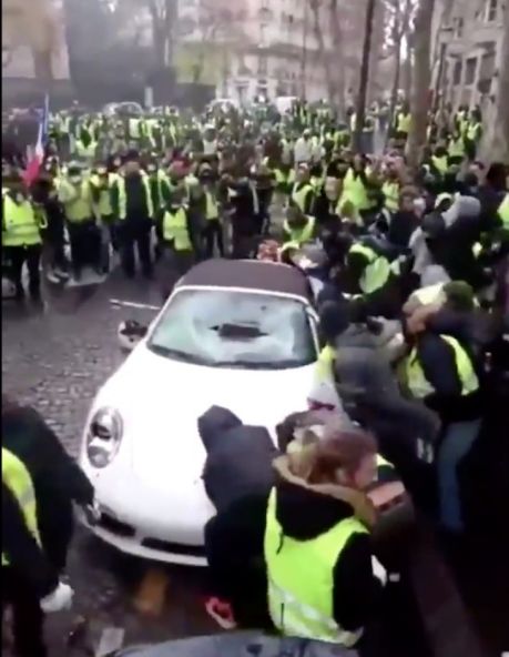 示威者抡起锤头砸警车。令法媒津津乐道的是,当天一辆豪华跑车也被示威者围堵砸窗。