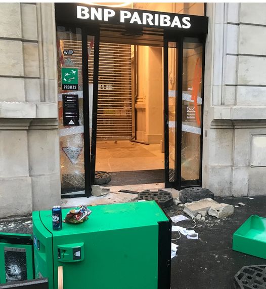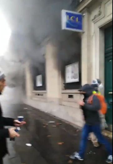 在奥斯曼大街上的一家LCL银行着火。据法媒报道,上周六(24日)在香榭丽舍大街的“黄马甲”抗议活动已然造成了至少100万欧元的损失。