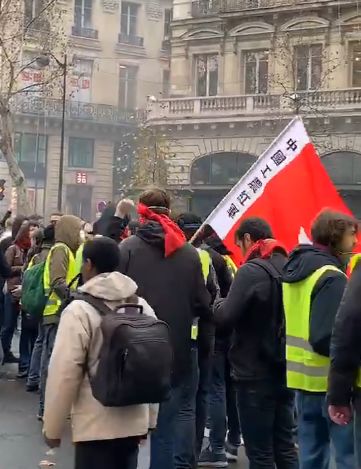 在聚集于奥斯曼大街的一群示威者中,有人甚至打出”中国工农红军“旗帜。(图片来源:欧洲时报微博视频截图)