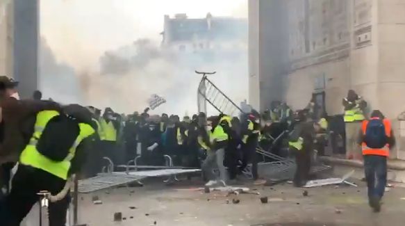 尽管警方事先做了比较充分的准备,12月1日发生在巴黎的示威仍然出现了失控的场面。由于警力主要部署在香街一带,尤其是总统府爱丽舍宫附近,而且进入香街必须接受安检和身份检查,因此当天上午香街的示威人数并不太多,而且在现场接受采访的示威者表示赞成和平抗争,但示威者在接近警戒线时仍然受到了催泪弹和高压水龙的“侍候”,部分示威者因此受伤。但他们仍然抵达了香街尽头的凯旋门,在无名烈士墓前举起三色旗,高唱马赛曲,上演了极富象征意义的一幕。不知是谁在他们之前留下了标志性的口号:黄衫凯旋!