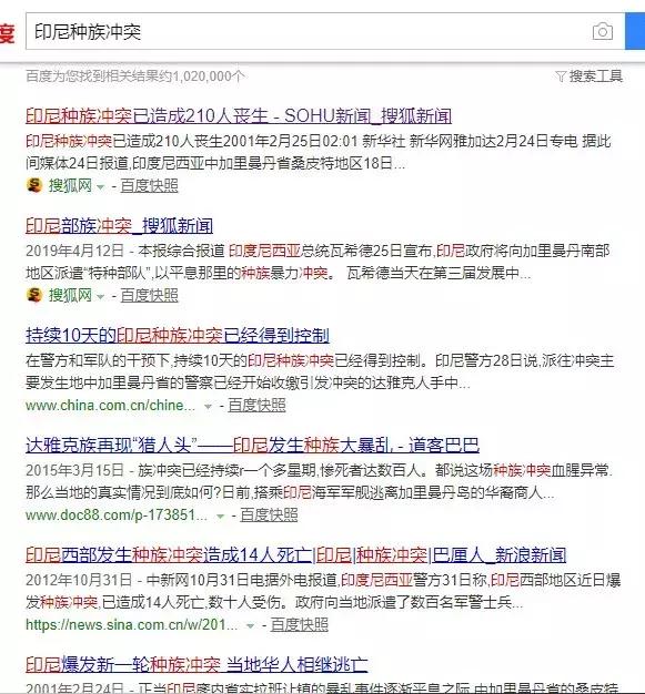 在网上随便搜索“印尼种族冲突”,你都不用往下滑,就可以发现从2001年到2019年,印尼发生的种族冲突几乎就没有间断过。