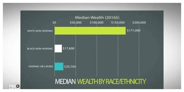 美国不同族裔家庭拥有财产的中位数分别为:白人,17万美元;黑人,1.8万美元;西班牙裔,2万美元。