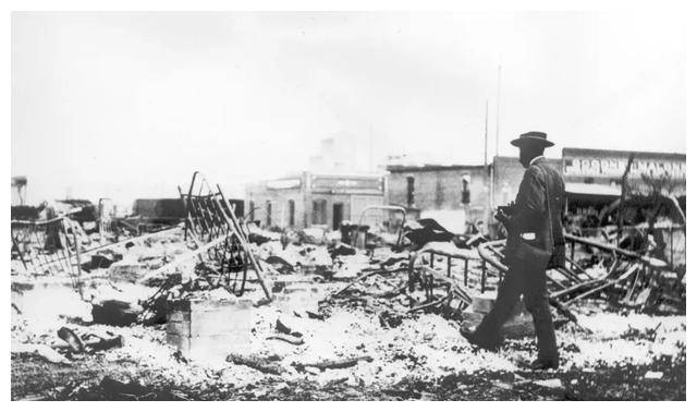 塔尔萨种族大屠杀后,摄影师在烧毁的废墟中行走