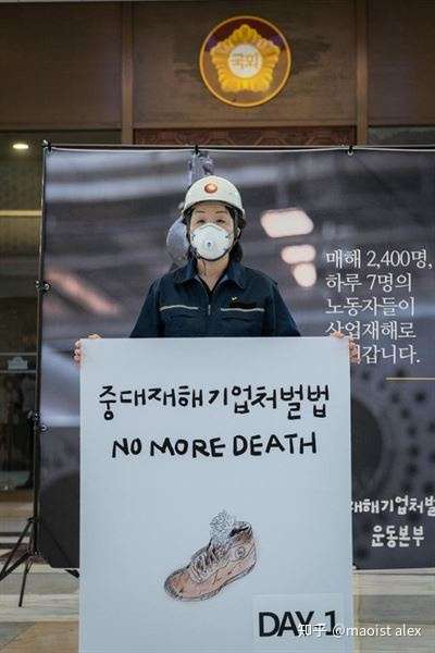 2020年9月7日,正义党议员沈相奵在国会举行一人抗议活动,敦促议员们通过一项法案,对严重工业事故的责任人规定更严厉的处罚。