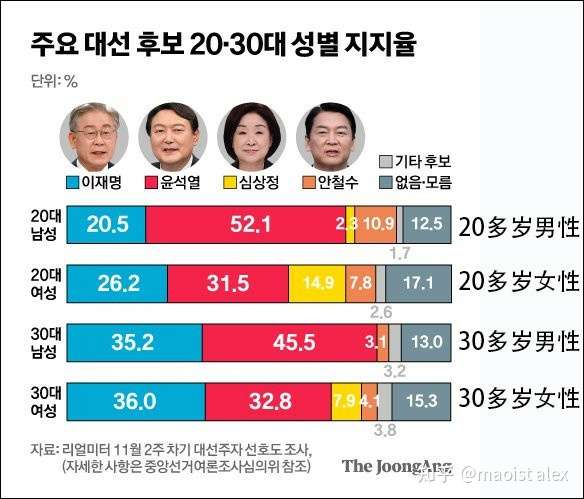 2022年2月份民调,左翼政党似乎在20多岁年轻人中失去支持,大概因为文在寅在任期间韩国房价上涨了一倍吧