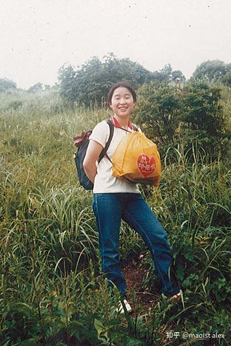 24岁的沈相奵在组织历史性罢工的两年前,与她在大宇服装公司的同事一起徒步旅行。