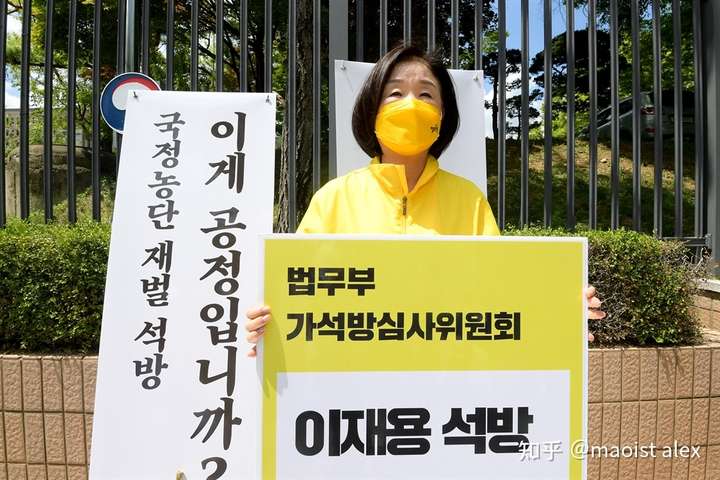 正义党的沈相奵议员在京畿道果川市政府大楼前举行一人抗议活动,反对司法部对三星电子副会长李在镕的假释决定