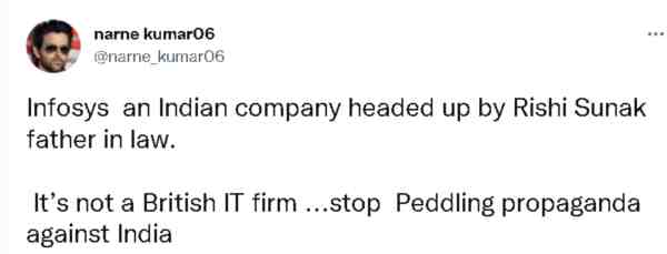 其中,有印度网民就发帖强调着耿直哥上面提到的那个观点,即印孚瑟斯是家印度公司,应该对印度的股东而不是英国的政治负责,用这家印度公司去攻击苏纳克不仅非常荒诞,而且是在搞“反印度”政治宣传。