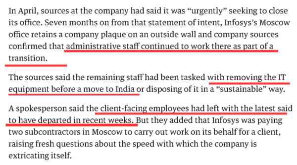 因为从该报陈述的事实部分来看,在今年4月宣布会撤出俄罗斯后,印孚瑟斯虽然在莫斯科仍然保留了一个办公室,但这个办公室其实是公司当地的行政人员用于进行工作交易和设备处理的,其他负责接待客户的雇员都已经离开了。此外,虽然《卫报》称印孚瑟斯仍然在通过两个下级承包商给一个俄罗斯客户提供服务,但该服务是宣布撤出后新签订的合作,还是宣布撤出前已经签订合同的客户,这家英国媒体却没有说明。