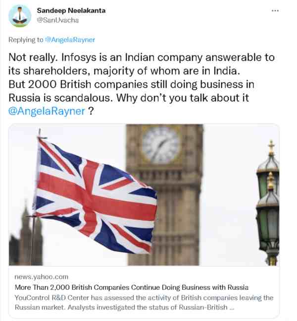 同时,还有印度网民发现,有乌克兰媒体在今年9月时曾报道说英国自家的企业也在和俄罗斯生意,而且规模多达2000多家。有印度网民就讽刺说:与其干涉一家绝大多数股东是印度人的印度企业,你们英国人怎么不说说自家企业的问题?