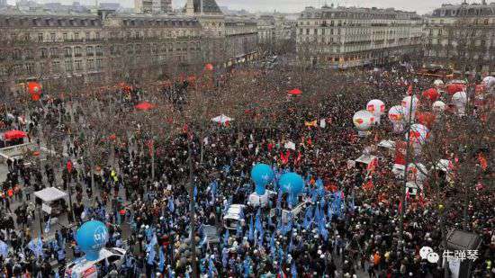 你不妥协,那我就罢工罢课罢市,让全法国都瘫痪。1月19日,据说法国八大工会一起行动,100多万人上街,公务员不工作了,教师不上课了,打工者也不打工了。
