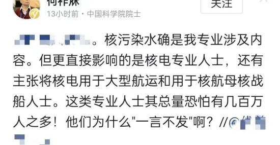 与此同时,却对日本排放核污水事件声称此事应该有专业人士来进行评判,广大网友无权做出批判。