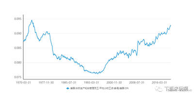 这样的临时工,加剧了工人力量的分化,进一步导致工人的工资不断下滑。这个图是美国工人实际小时工资走势图,可见美国工人工资从1973年开始下滑,到90年代中后期才逐步上升,但是直到现在都没达到1973年的水平。也就是说,美国工人实际工资长时间看并没有增长。