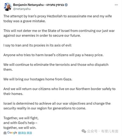 内塔尼亚胡在社交媒体表示:“伊朗代理人真主党今天企图暗杀我和我的妻子是一个严重的错误。这不会阻止我或以色列国继续与我们的敌人进行正义战争,以确保我们的未来。”