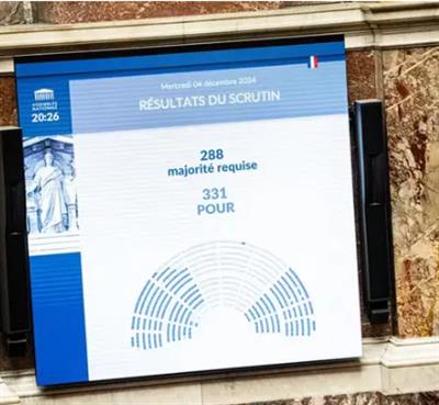 法国今天举行了议会对政府的不信任投票,结果在这次投票中有331票支持推翻政府。投票通过,因此法国现总理必须辞职,而法国现总理组织的这场直接政府仅仅才三个月时间。