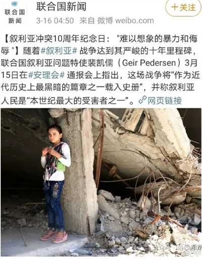 联合国官方账号则指出:叙利亚人民遭到了“难以想象的暴力和侮辱”,叙利亚内战是“近代历史上最黑暗的篇章之一”。