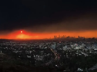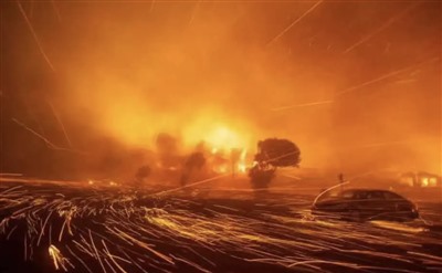 从太空看,你会觉得美国加州刚刚打了一场“世界大战”,天空暗红浓烟遮蔽,烈火所到之处一片废墟,甚至烧出了“火风暴”和“火积云”,比加沙、巴赫穆特还惨烈,仿佛遭了核弹打击一般。
