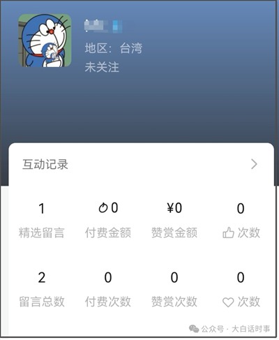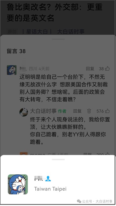 这是典型的殖人发言,这个用机器猫当头像的人,在我公众号上留言,外面看到的IP是四川,但点开他的头像,个人简介里的地区是对岸。