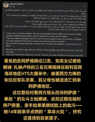 阿萨德政权的倒台,哈哪迪一家是出了大力的,如今仅仅因为就恰好居住在哪里,全家就差点被杀光,说明这不仅是大屠杀,而且是敌我不分的大屠杀,朱拉尼政权连最基本的统战能力都没有,是直接奔着杀光当地所有居民去的,根本就懒得做任何甄别工作。