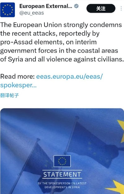 欧盟这份声明的意思就是朱拉尼政权虽然发起了大屠杀,但事出有因,如果不是因为阿萨德政权的支持者发动了反抗活动,那朱拉尼政府是不会发起大屠杀的,至于屠杀平民的行为那当然是不对的,我们谴责,但这事的主要责任还是因为有人首先挑起了武装冲突,只要不反抗那就不会有大屠杀。