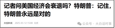 3月11日,有记者提问美国经济是否衰退。特朗普表示,他完全不觉得会出现衰退,他认为美国会繁荣起来。他告诉记者,“要记住,特朗普永远是对的”。