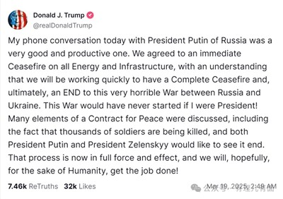 特朗普在社交媒体上则表示:“我同俄罗斯总统普京进行了非常愉快和富有成果的通话”,“我们希望,为了人类的利益,完成这项工作!”他顺便夸了一下自己:“如果我是总统,这场战争就不会开始。”