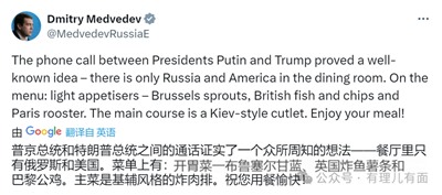 ——这是俄罗斯联邦安全会议副主席梅德韦杰夫对3月18日特朗普与普京的通话作出的评价。其中的隐喻对乌克兰总统泽连斯基是一记重击。