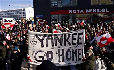 丹麦媒体大肆渲染格陵兰人在努克举牌抗议万斯的画面--“洋基佬 ,滚回去!”(Yankee Go Home.)