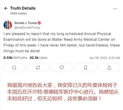 当地时间4月11日,忙得不可开交的特朗普接受了年度体验,这是他第二个总统任期内的首次体检。