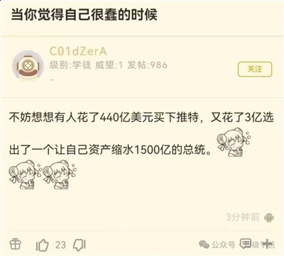 这件事也启发我们,人一定要豁达。股市赔钱、事业受挫的时候就想一想马斯克。他花了440亿美元买下推特,又花了3亿美元选出一个让自己资产缩水1500亿的总统。