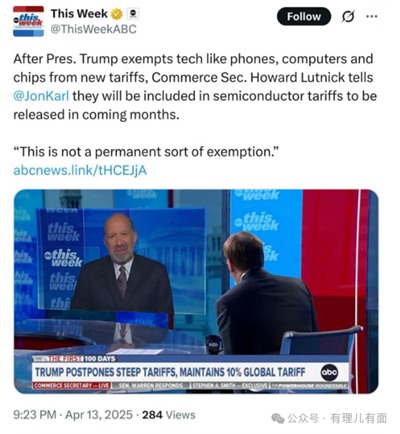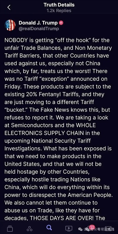 大概意思就是:我虽然豁免了关税,但是我没有豁免关税,虽然出现了例外,但是没有任何例外,一开始的20%关税不还在呢吗?所以我不是认怂投降了,相反,我们取得了阶段性胜利。