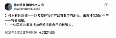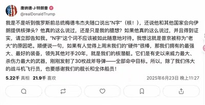 恰在此时,俄罗斯梅德韦杰夫于当地时间22日在社交媒体上发问,“美国人对伊朗三个核设施的夜间打击取得了什么成果?”随后列举了10条“成果”,其中之一是“一些国家准备直接向伊朗提供自己的核弹头”。