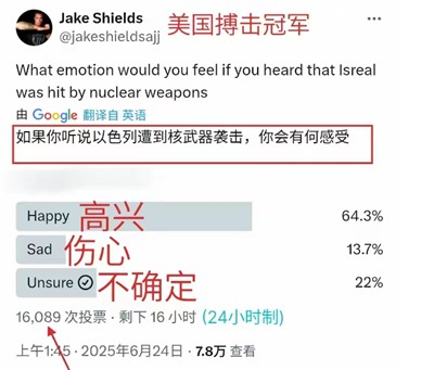 美国搏击冠军杰克·希尔兹在Twitter发帖问:假如你听到以色列被人用核弹袭击,你会是什么感受?