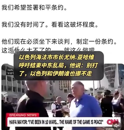 眼见当前形势大势不妙,以色列海法市市长尤纳·亚哈维开始呼吁结束中东乱局。他说,别打了,以色列和伊朗谁也挪不走。我们希望签署和平条约。我们没有时间了。看看这破坏程度,他们现在必须坐下来谈判,制定一份条约。这没什么大不了的,就这么做吧。