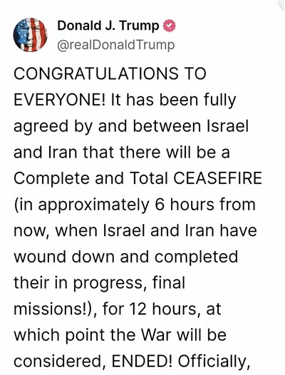 “祝贺大家!以色列和伊朗已完全同意,将进行全面彻底的停火(大约6小时后,以色列和伊朗将结束并完成他们正在进行的最后任务!),持续12小时,届时战争将被视为结束!伊朗将正式启动停火,12小时后,以色列将启动停火,24小时后,世界将向12天战争的正式结束致敬。在每次停火期间,对方将保持和平和尊重。假设一切正常,我想祝贺以色列和伊朗两国有毅力、勇气和智慧来结束这场应该被称为'12天战争'的战争。这场战争本可以持续多年,摧毁整个中东,但它没有,也永远不会!上帝保佑以色列,上帝保佑伊朗,上帝保佑中东,上帝保佑美利坚合众国,上帝保佑世界!”
