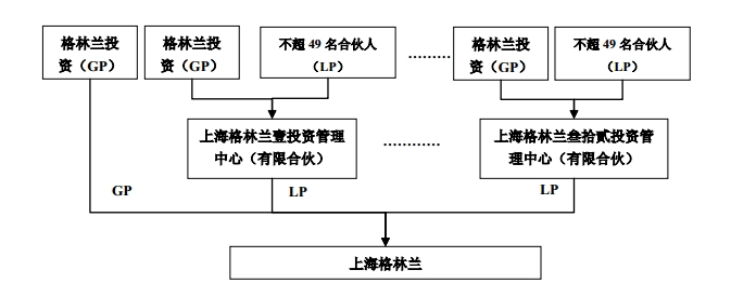 三、下图为上海格林兰的股权结构,在整个重组架构的安排中,这个层叠复制的有限合伙安排极为重要,充分体现了管理层和员工的利益诉求,并规避了以往通过信托结构进行利益安排的种种弊端。