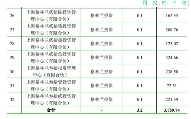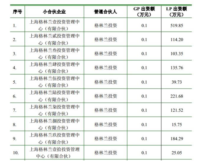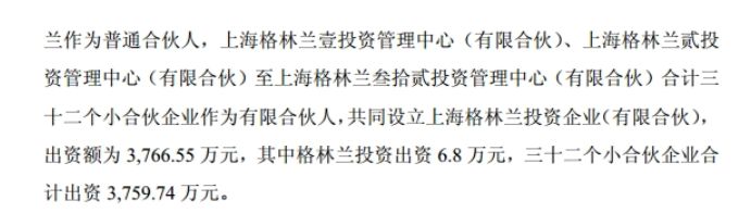 五、在此基础上,以32个小有限合伙安排为有限合伙人(LP),格林兰投资作为普通合伙人(GP),出资6.8万元(注册资本10万元,其余的3.2万元已经作为对32个小有限合伙安排的出资),成立了大的有限合伙安排“上海格林兰”。这是关键安排的第二步:张玉良通过注册资本仅有10万元的格林兰投资,控制了3766.55万元的内部人持股权。