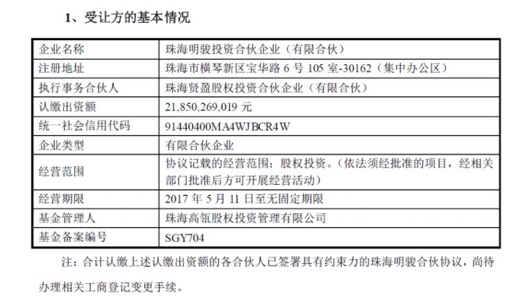 二、 珠海明骏以46.17元/股的价格受让格力集团持有的格力电器902,359,632股股份(占格力电器总股本的15%),合计转让价款约为416.62亿元。但根据日前公告,接盘方珠海明骏LP们的认缴出资额约为218.5亿元,尚有近200亿元的资金缺口。