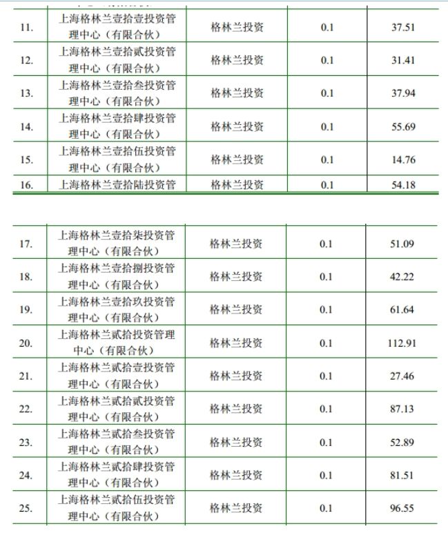 在绿地集团的混改方案中,直接持有“混改”后上市公司股权的是上海格林兰投资企业(有限合伙),而在上海格林兰的上面,则是一组多达32个的小型有限合伙安排,在这个结构中,唯一的GP就是张玉良直接控制下的管理层实体格林兰投资(具体见下文);