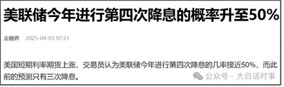 但这次特朗普宣布加高额的对等关税后,市场对美联储降息预期反而升温了。