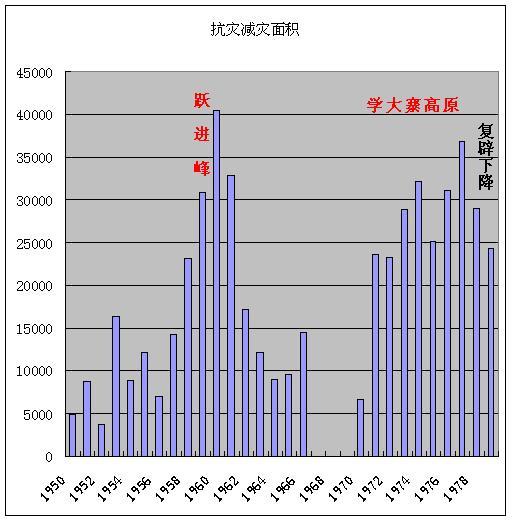 由于大大夸大了灾情,把没有受灾的面积作为抗灾救灾面积了,所以这十九年里的抗灾救灾面积全是水分,完全不能相信。即使如此减灾系数还只有50.2%,不但大大小于文革学大寨时期的72.8%,甚至还不如解放初的51.6%。