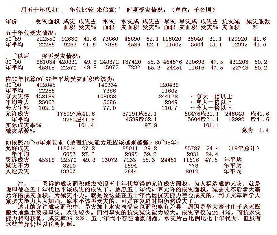 这儿一点没有冤枉右派官僚。这是和五十年代比,可能的受灾面积以及同样抗灾能力下的允许成灾面积。按理有了文革及学大寨留下的水利底子比五十年代抗灾能力强得多,许多五十年代会受灾的土地不该受灾了。抗灾不力当是大大缩小的,在五十年代我们抗灾是很得力的,尤其大跃进的1958年和1959年。这一比较实际是认为改x以来具有和五十年代一样的抗灾减灾努力,这是大大地不符合事实的。但是相应地,人祸造成的天灾没有那么高。有一部分抗灾不力、或没有抗灾而成灾的被算作人为天灾了。但两者之和造成的成灾面积,应该和实际情况差不离。