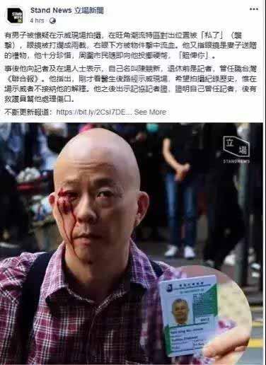 出生在香港本地,并于上世纪90年代活跃在港台两地的台湾《联合报》前香港记者陈竞新在旺角示威现场被打。