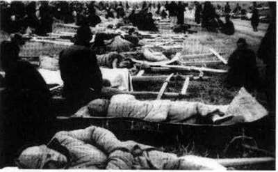 再由支前民工转运到师、旅级卫生处(救护所),检伤,交换敷料,做紧急手术处置但不做初期缝合(因为离火线太近),普遍注射破伤风抗毒素,大量补液(口服或静脉滴注),防治休克,留治轻伤,填写伤票和作好战伤登记统计工作,再将重伤员转运至纵医院进行手术。