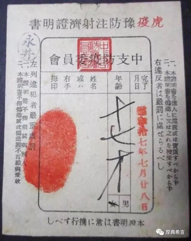 “虎疫”,即民国时期急性传染病霍乱和鼠疫的统称。这张证明书上写着注射日期、被注射人的姓名(手印)和年龄。尾端的日文意思是“本证明书必须随身携带”,以备随时检查。